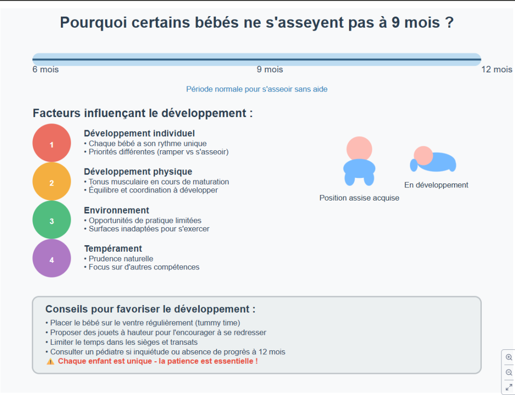 - Facteurs médicaux : tonus musculaire faible, déséquilibre lombo-pelvien, ou prématurité peuvent ralentir le processus.